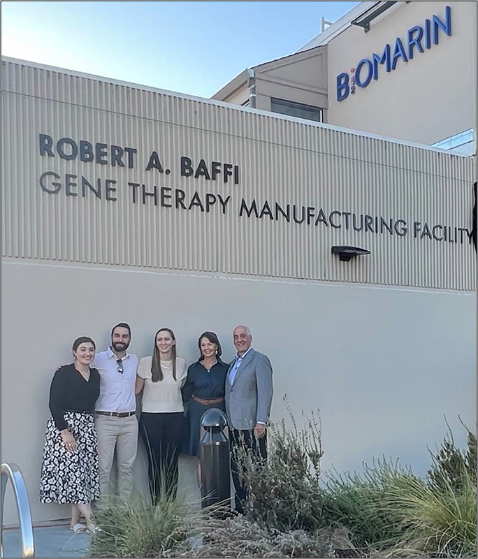 The new building name—Robert A. Baffi Gene Therapy Manufacturing Facility—commemorates more than two decades of extraordinary contributions by Dr. Baffi before his retirement from BioMarin in 2020. A visionary leader for our Technical Operations organization and company more broadly, Dr. Baffi guided BioMarin through many of the most important advances in our 25-year history, from expanding our state-of-the-art core facilities in Novato, to purchasing our Shanbally facility in Ireland, to turning a Novato office building into a full cGMP (current Good Manufacturing Practices) gene therapy manufacturing facility